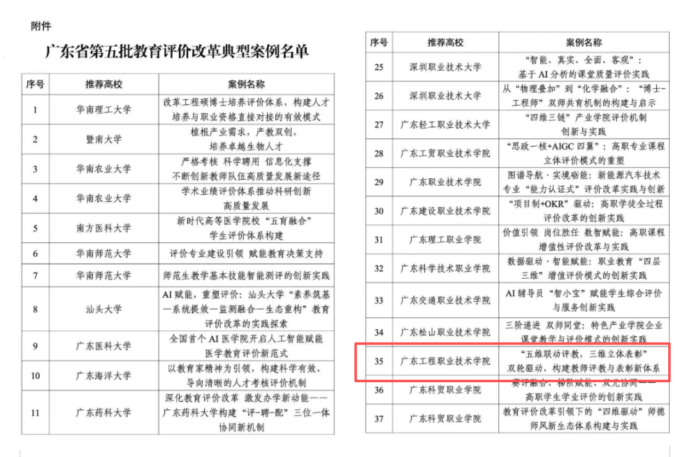 近日,广东省教育厅公布五批教育评价改革典型案例名单,其中职业教育典型案例共33个,我校教务部刘雅莉老师主笔的案例《“五维联动评教,三维立体表彰”双轮驱动,构建教师评教与表彰新体系》成功入选。这一成果是对我校深化教师评价、深入推进教育评价改革的高度认可。