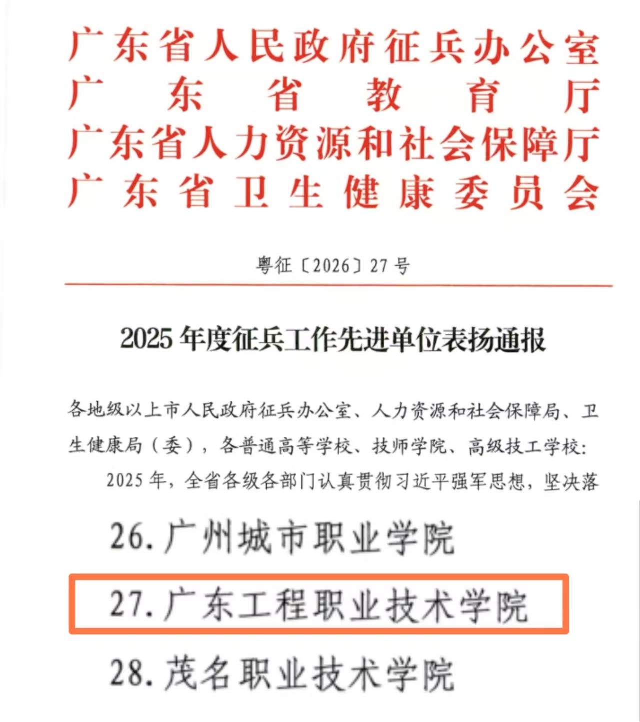 近日,广东省人民政府征兵办公室、广东省教育厅、广东省人力资源和社会保障厅、广东省卫生健康委员会联合下发表彰通报,我校获评“2025年度征兵工作先进单位”,学校已连续六年荣获省级通报表彰。此项荣誉既是上级部门对我校征兵工作成效的高度认可,更是对我校践行国防育人责任、助力强军建设的有力激励。