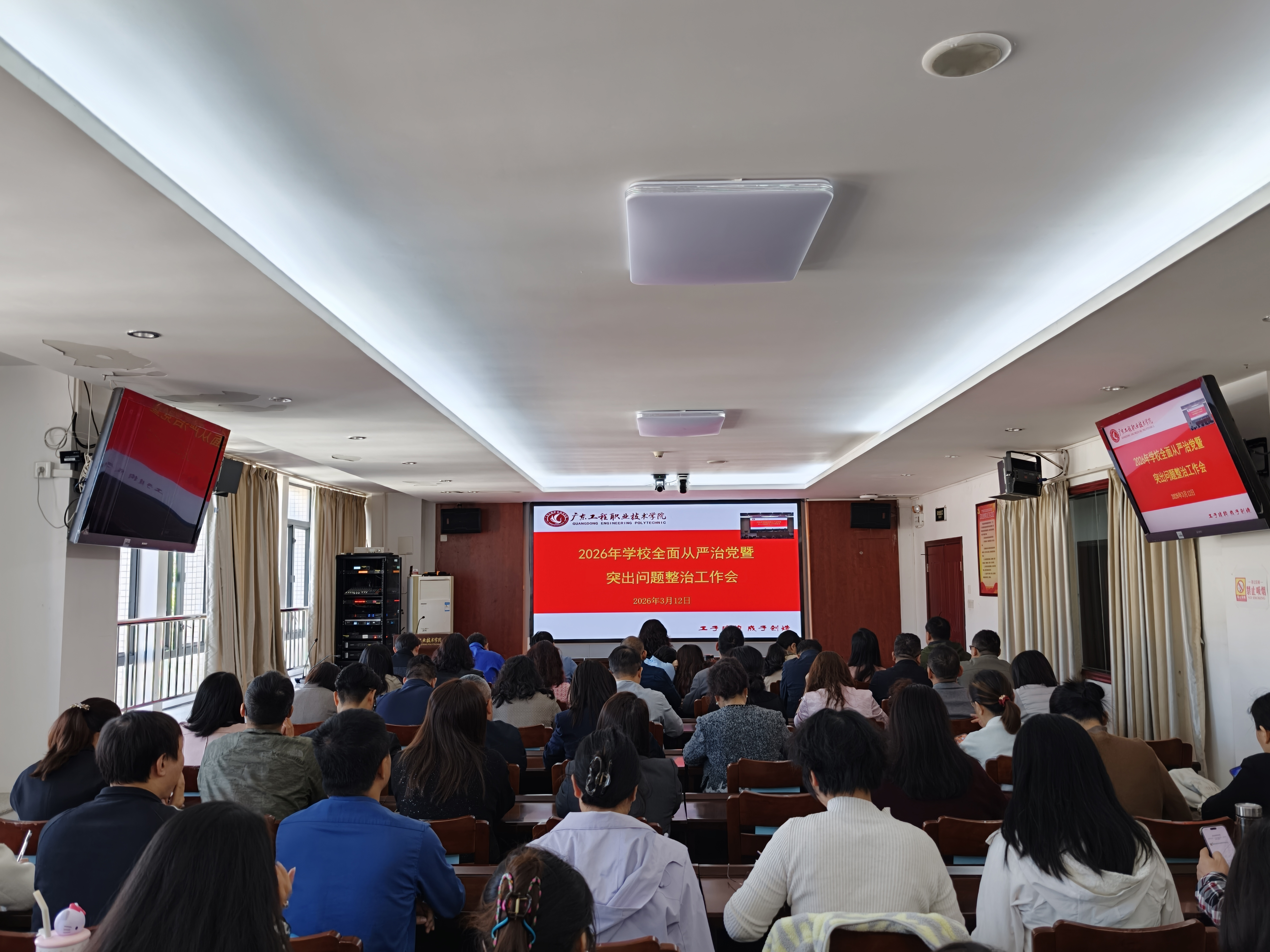 3月12日上午,学校在广州校区办公楼511室与省职教城校区办公楼报告厅召开2026年全面从严治党工作暨突出问题整治工作会议,总结2025年学校全面从严治党工作,部署安排2026年工作,布置突出问题整治工作。全体校领导、党委委员、纪委委员,中层干部,党支部书记,纪检委员、组织员、特约监督员参会。学校党委副书记陈冬梅主持会议。