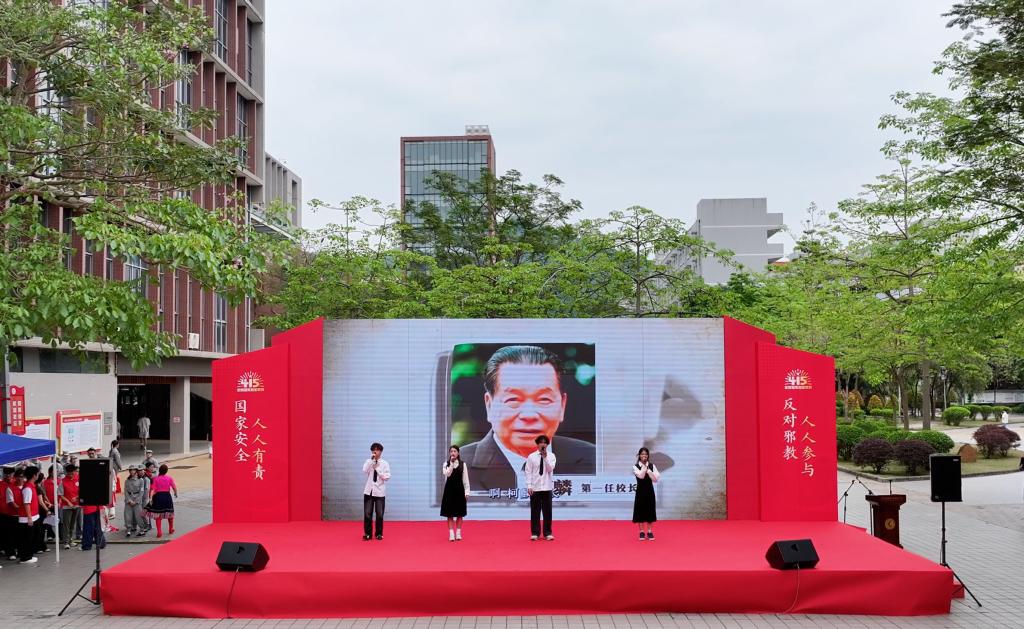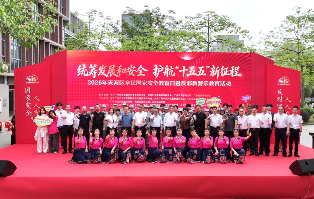 4月15日,为深入践行总体国家安全观,全面宣传国家安全法律法规,深化反邪教警示教育,2026年天河区全民国家安全教育日宣传教育暨反邪教警示教育活动启动仪式在学校天河校区举办。天河区委国安办、天河区委政法委、广州市公安局天河分局、凤凰街党工委、区国家保密局、区密码管理局、区司法局、区商务局、区卫生健康局、区退役军人事务局、区消防救援局、区反邪教协会、区法学会等部门领导和学校领导,以及300多名师生参加了活动仪式。