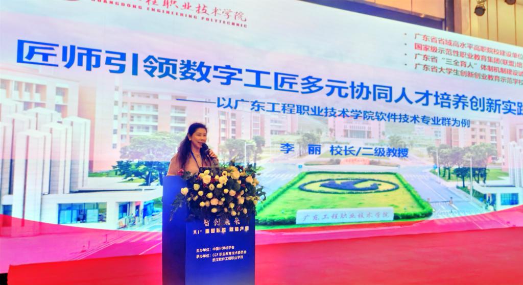 在大会上,李丽校长以“匠师引领数字工匠多元协同人才培养创新实践——以广东工程职业技术学院软件技术专业群为例”为题,向300多名与会领导、专家和同行,专题报告我校近年来尤其是省域双高校建设以来在数字工匠人才培养的创新和实践。她介绍,学校以软件技术专业国家级教师创新团队建设为核心,聚焦新一代信息技术赋能粤港澳大湾区先进制造业,积极构建了“立信铸魂、数智筑基、平台聚力、融合赋能”的产教融合团队建设模式,重点培育了一批具备“数智育人、科教融汇、跨界创新”能力的数字匠师。