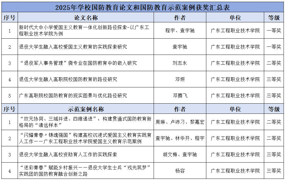 近日,广东省国防教育学会公布2025年学校国防教育示范案例和国防教育论文征集活动获奖名单。我校老师表现优秀,共荣获9项荣誉,其中一等奖2项、二等奖3项、三等奖4项,充分展现了我校老师在国防教育实践育人方面的扎实成效。