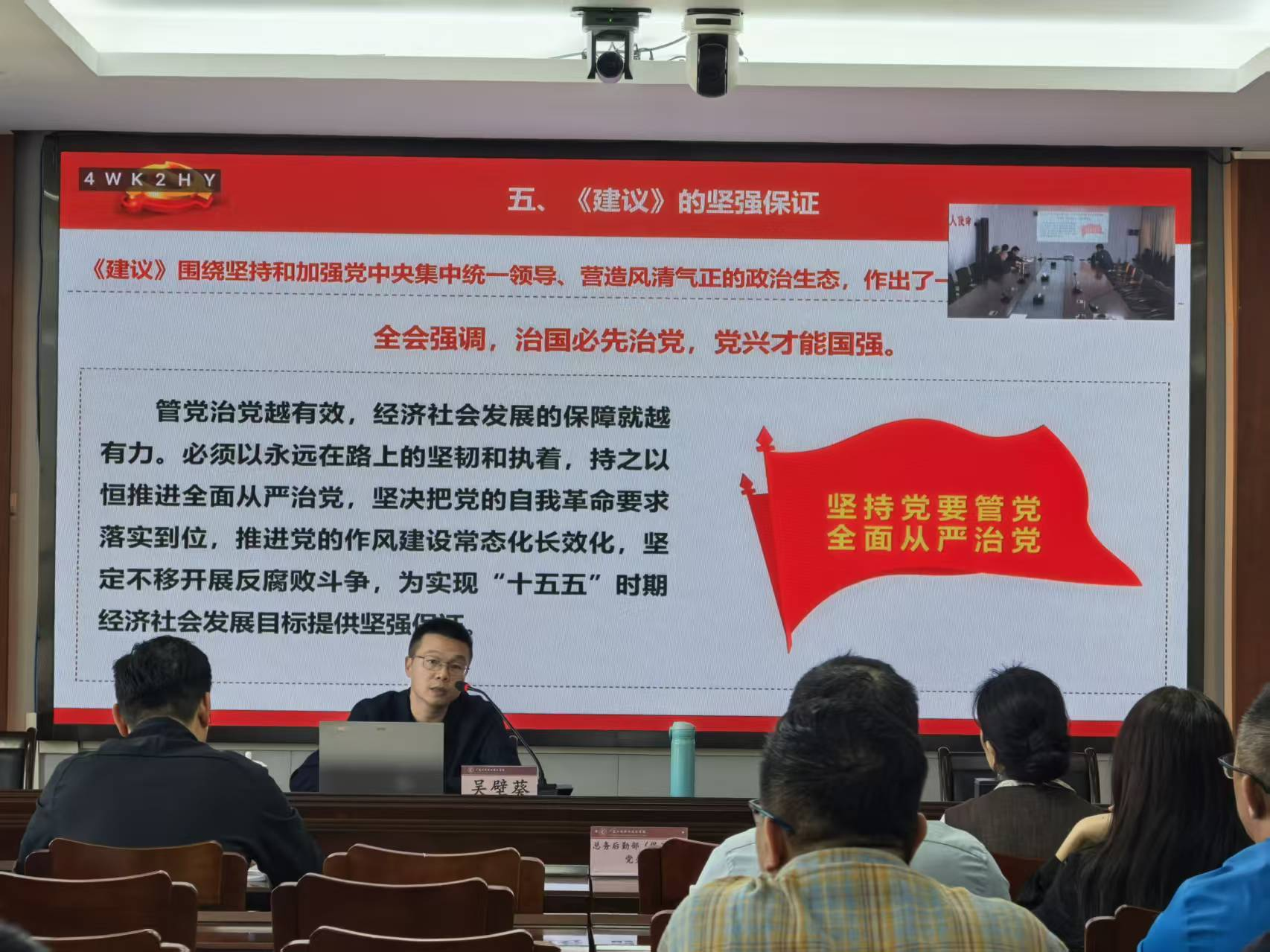 12月5日,学校党委委员、纪委书记吴壁葵以“深学笃行党的二十届四中全会精神 勇担事业高质量发展新使命”为主题,为智能工程学院教师党支部、总务后勤部(保卫部)党支部、纪检室党支部全体党员讲授专题党课。吴壁葵书记结合我校办学实际,系统梳理总结了“十四五”期间各项事业发展取得的显著成效,结合《中共中央关于制定国民经济和社会发展第十五个五年规划的建议》的指导思想和坚强保证,围绕省域“双高校”建设与“建高升本”核心目标,对与会党员提出了新的要求。他指出,在即将到来的十五五期间,要持续巩固拓展学习教育成果,推进作风建设常态化长效化。学校纪委将以党的二十大精神以及历次全会精神为指引,持续完善“五位一体”监督体制机制,党员干部要在后勤管理、科研经费、校企合作、师德师风各领域开展自查,以自我革命“组合拳”为学校高质量发展清障护航。