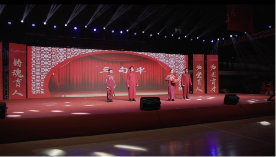 为了让理论宣传既有高度又接地气,四名教师手持锣鼓镲表演“三句半”,用通俗幽默又饱含深意的语言,生动讲述了马克思主义学院在专业建设、教学改革、理论创新、服务社会等方面的探索与成就,通过传统曲艺与时代主题的巧妙融合,获得整整掌声。