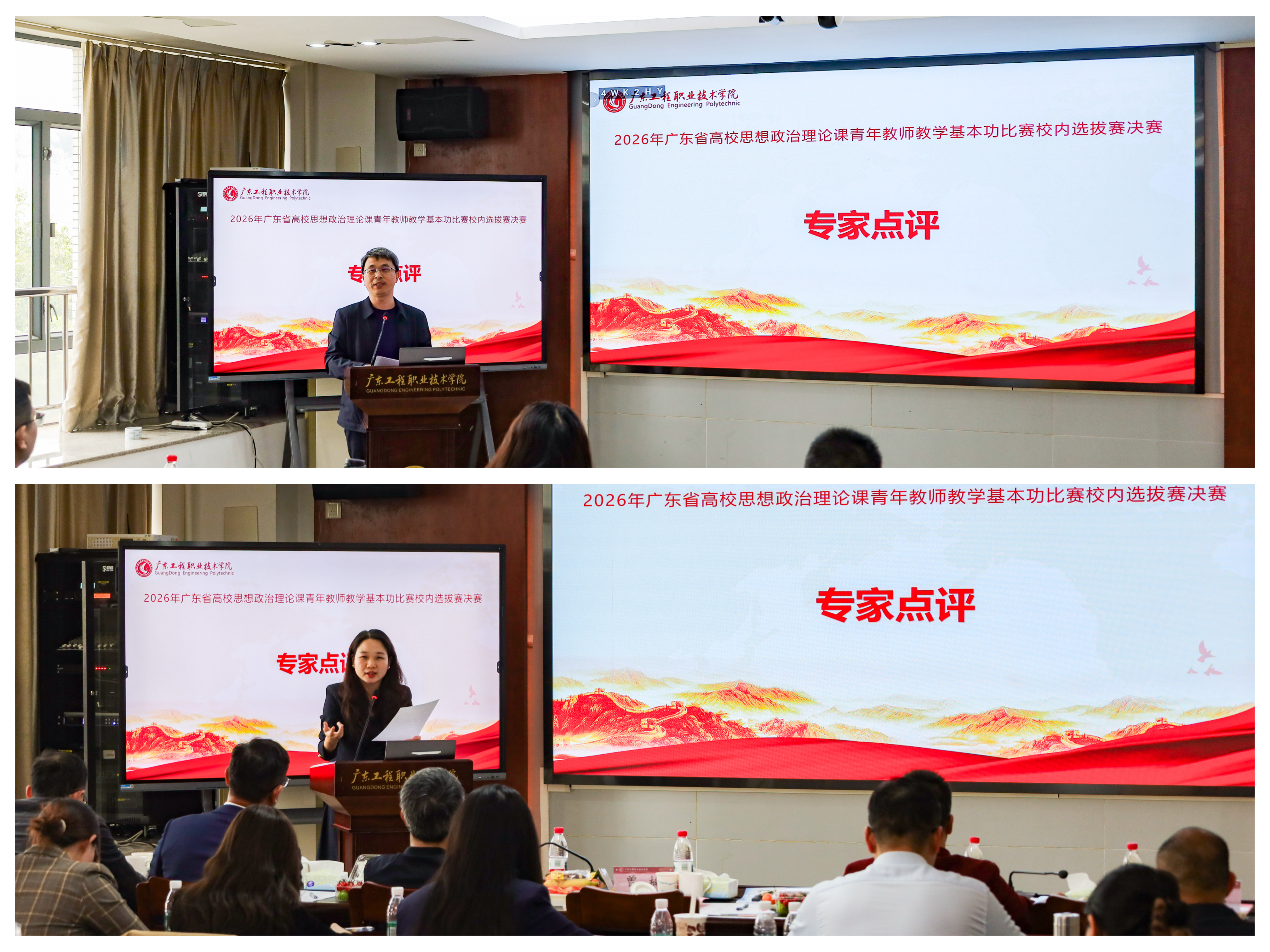 本次现场决赛严格按照广东省高校思想政治理论课青年教师教学基本功比赛的要求进行,采取现场授课和答辩的形式,全面考察了参赛教师的综合教学能力。童建军教授和曾楠教授分别对比赛进行专家点评,同时,外校专家也对全体思政课教师进行了教学能力提升的专题培训。