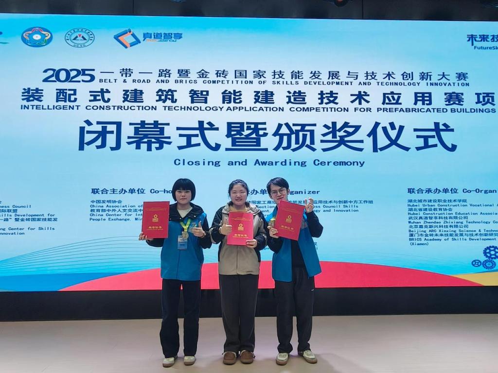 2025年10月22日至10月24日,建筑工程学院学生冯诗棋、莫爵桓在指导教师孙天玮、廖锶禾的带领下,赴湖北城市建设职业技术学院参加“2025年‘一带一路’暨金砖国家技能发展与技术创新大赛——装配式建筑智能建造技术应用赛项”全国总决赛。经过与全国各高校代表队紧张激烈的角逐,2名参赛学生凭借扎实的专业基础、熟练的操作技能与稳定的现场发挥,最终荣获大赛二等奖。同时,学校因组织工作表现突出、参赛表现优异,被大赛组委会授予“优秀组织奖”。