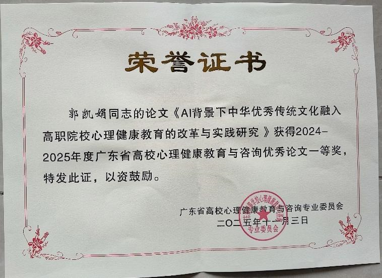 2025 年11月3-4日,2024-2025 年度广东省高校心理健康教育与咨询专业委员会学术年会在中山召开。大会由广东省高校心理健康教育与咨询专业委员会主办,全省近百所高校学生工作相关领导、专兼职心理老师代表共240余人参会。大会表彰了广东省高校心理健康教育与咨询工作先进集体71所、广东省高校优秀心理中心主任(负责人)45人、先进个人80多人、优秀论文(一等奖18个)及出版物20个。