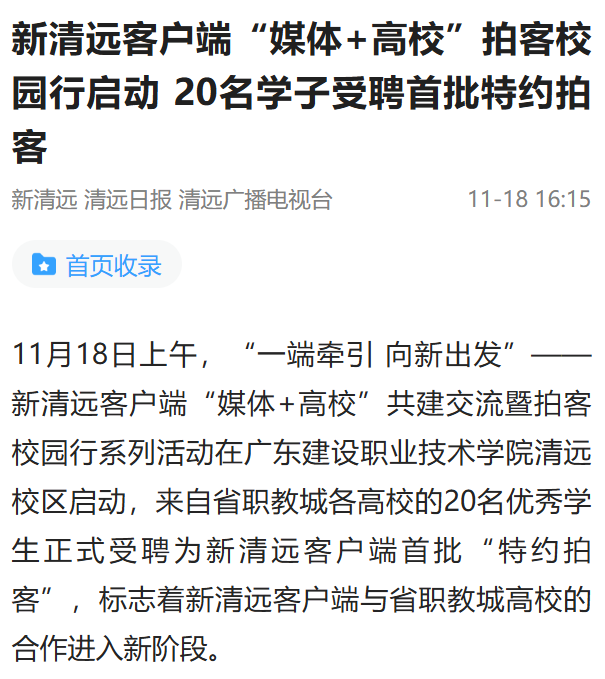11月18日上午,“一端牵引 向新出发”——新清远客户端“媒体+高校”共建交流暨拍客校园行系列活动在广东建设职业技术学院清远校区启动,来自省职教城各高校的20名优秀学生正式受聘为新清远客户端首批“特约拍客”,标志着新清远客户端与省职教城高校的合作进入新阶段。