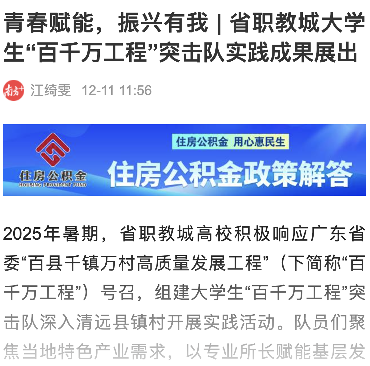 2025年暑期,省职教城高校积极响应广东省委“百县千镇万村高质量发展工程”(下简称“百千万工程”)号召,组建大学生“百千万工程”突击队深入清远县镇村开展实践活动。队员们聚焦当地特色产业需求,以专业所长赋能基层发展,累计涌现一批务实有效的实践成果。
