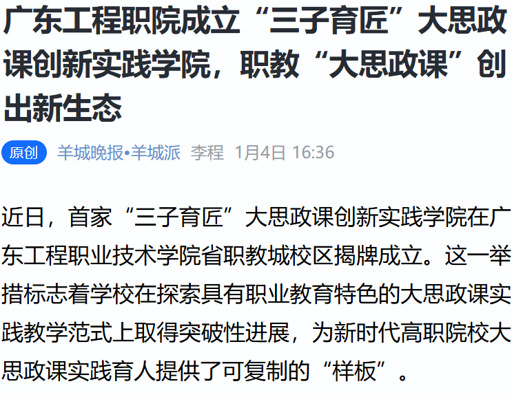 近日,首家“三子育匠”大思政课创新实践学院在广东工程职业技术学院省职教城校区揭牌成立。这一举措标志着学校在探索具有职业教育特色的大思政课实践教学范式上取得突破性进展,为新时代高职院校大思政课实践育人提供了可复制的“样板”。