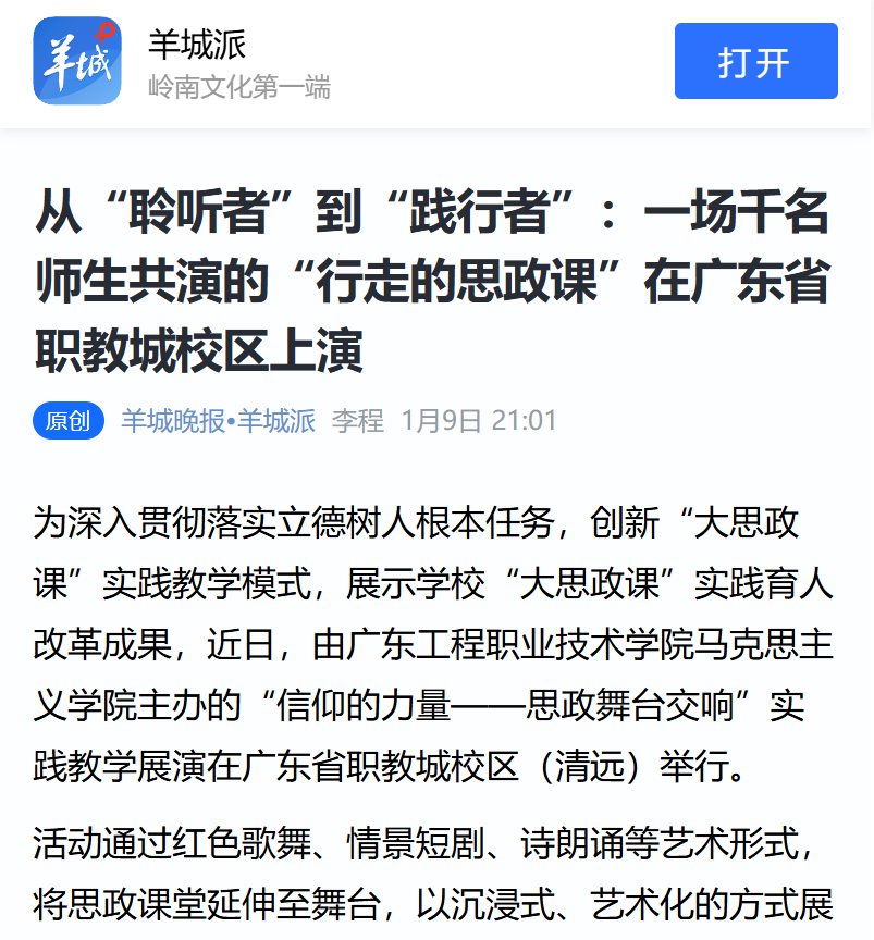 为深入贯彻落实立德树人根本任务,创新“大思政课”实践教学模式,展示学校“大思政课”实践育人改革成果,近日,由广东工程职业技术学院马克思主义学院主办的“信仰的力量——思政舞台交响”实践教学展演在广东省职教城校区(清远)举行。