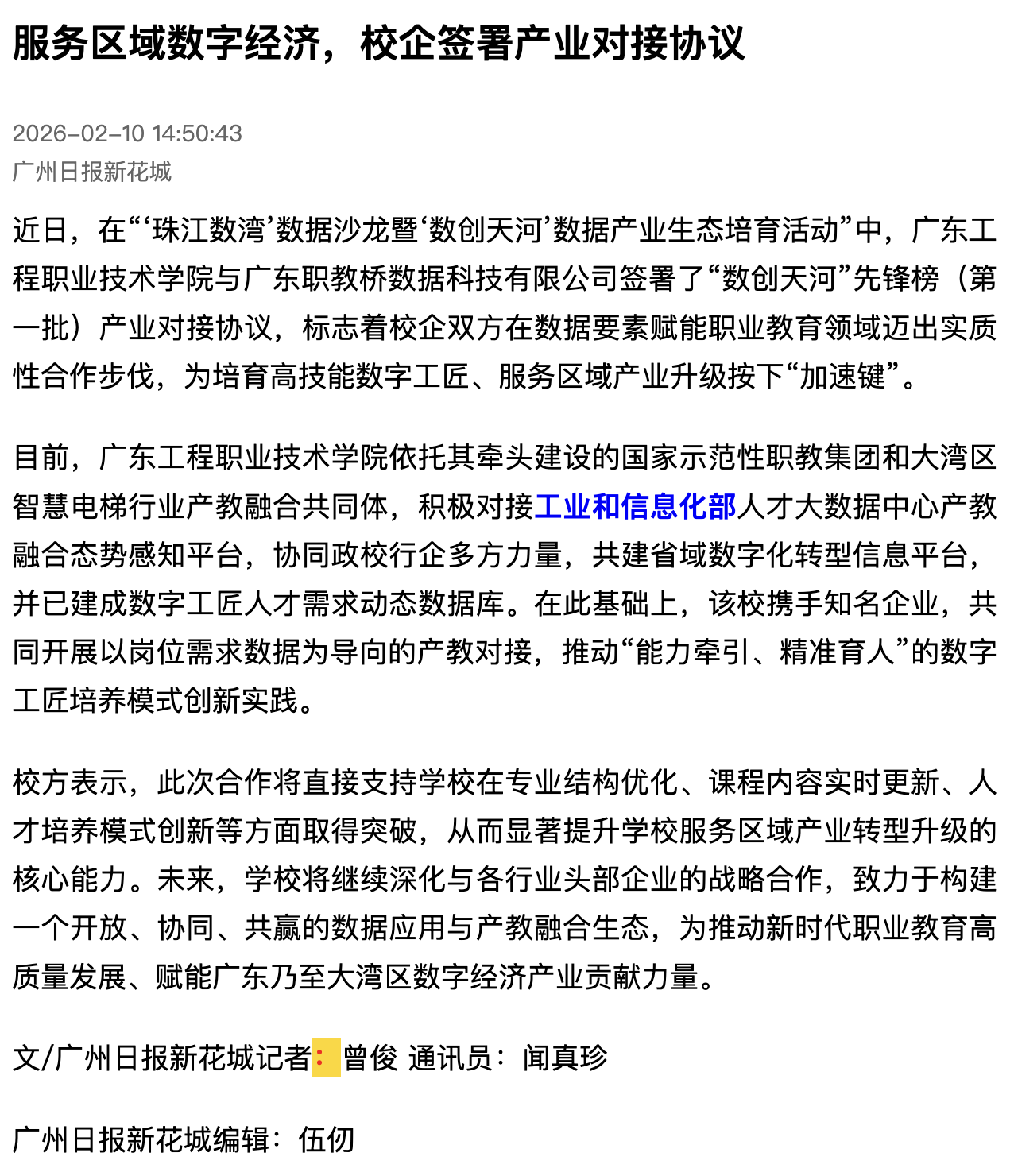 近日,在“‘珠江数湾’数据沙龙暨‘数创天河’数据产业生态培育活动”中,广东工程职业技术学院与广东职教桥数据科技有限公司签署了“数创天河”先锋榜(第一批)产业对接协议,标志着校企双方在数据要素赋能职业教育领域迈出实质性合作步伐,为培育高技能数字工匠、服务区域产业升级按下“加速键”。