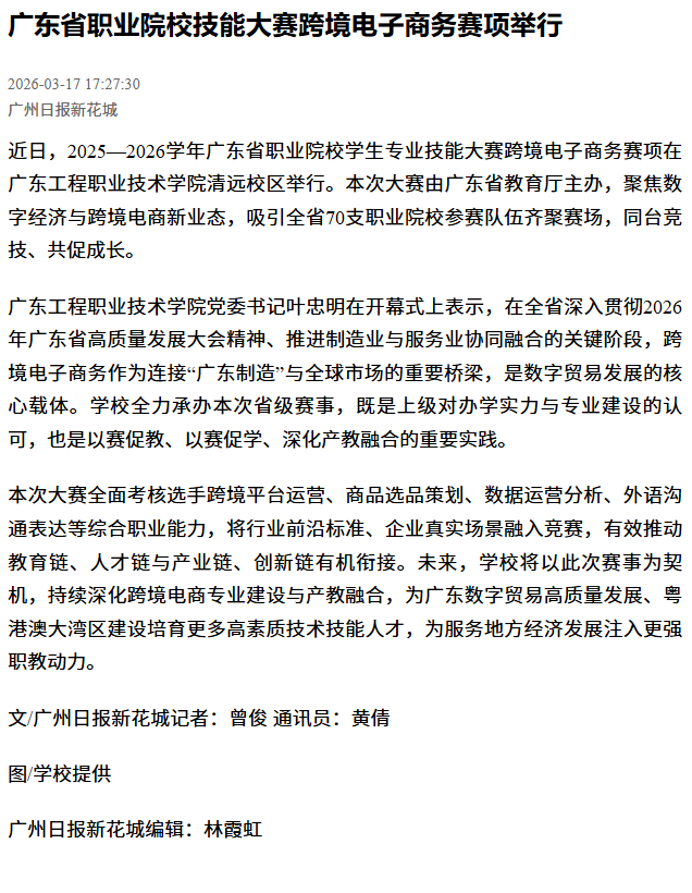 本次大赛全面考核选手跨境平台运营、商品选品策划、数据运营分析、外语沟通表达等综合职业能力,将行业前沿标准、企业真实场景融入竞赛,有效推动教育链、人才链与产业链、创新链有机衔接。未来,学校将以此次赛事为契机,持续深化跨境电商专业建设与产教融合,为广东数字贸易高质量发展、粤港澳大湾区建设培育更多高素质技术技能人才,为服务地方经济发展注入更强职教动力。