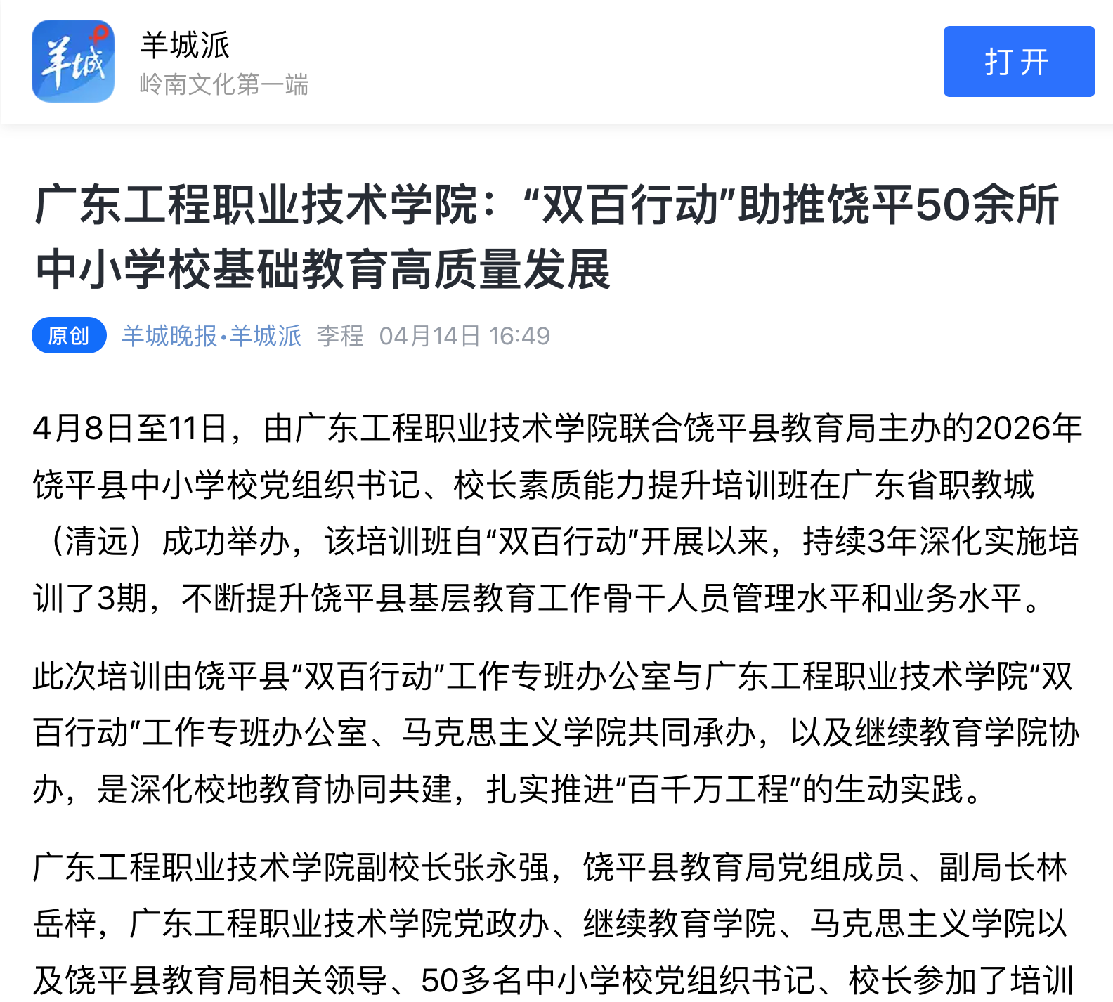 4月8日至11日,由广东工程职业技术学院联合饶平县教育局主办的2026年饶平县中小学校党组织书记、校长素质能力提升培训班在广东省职教城(清远)成功举办,该培训班自“双百行动”开展以来,持续3年深化实施培训了3期,不断提升饶平县基层教育工作骨干人员管理水平和业务水平。