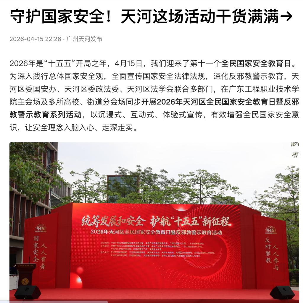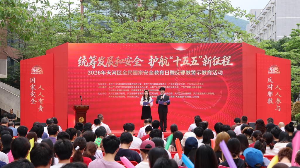 2026年是“十五五”开局之年,4月15日,我们迎来了第十一个全民国家安全教育日。为深入践行总体国家安全观,全面宣传国家安全法律法规,深化反邪教警示教育,天河区委国安办、天河区委政法委、天河区法学会联合多部门,在广东工程职业技术学院主会场及多所高校、街道分会场同步开展2026年天河区全民国家安全教育日暨反邪教警示教育系列活动,以沉浸式、互动式、体验式宣传,有效增强全民国家安全意识,让安全理念入脑入心、走深走实。