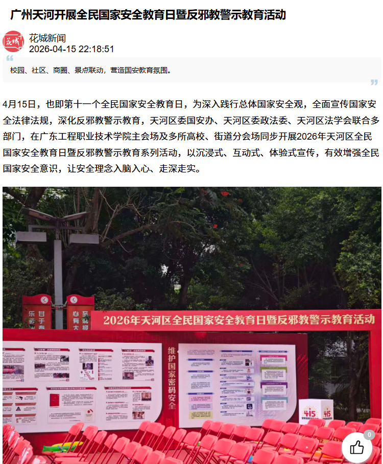 4月15日,也即第十一个全民国家安全教育日,为深入践行总体国家安全观,全面宣传国家安全法律法规,深化反邪教警示教育,天河区委国安办、天河区委政法委、天河区法学会联合多部门,在广东工程职业技术学院主会场及多所高校、街道分会场同步开展2026年天河区全民国家安全教育日暨反邪教警示教育系列活动,以沉浸式、互动式、体验式宣传,有效增强全民国家安全意识,让安全理念入脑入心、走深走实。