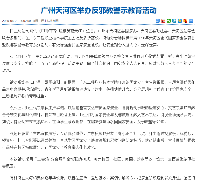 民主与法制网讯(孙守森 通讯员范天河)近日,广州市天河区委国安办、天河区委政法委、天河区法学会联合多部门,在广东工程职业技术学院主会场及多所高校、街道分会场同步开展2026年天河区全民国家安全教育日暨反邪教警示教育系列活动,有效增强全民国家安全意识,让安全理念入脑入心、走深走实。